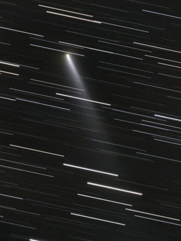 (Das obige Bild ist auf den Kometen „registriert“, weshalb sich dessen Bewegung in den Strichspuren der Sterne widerspiegelt.)