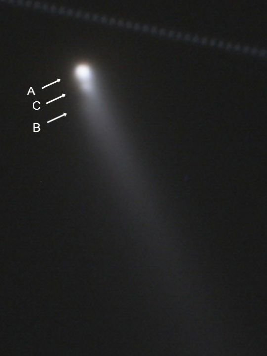 Während Fragment C noch gut zu sehen ist, ist das zwölf Tage zuvor als erstes abgebrochene Stück B nahezu vollständig zerbröselt und nur noch als Ausbuchtung im Schweif zu erahnen.