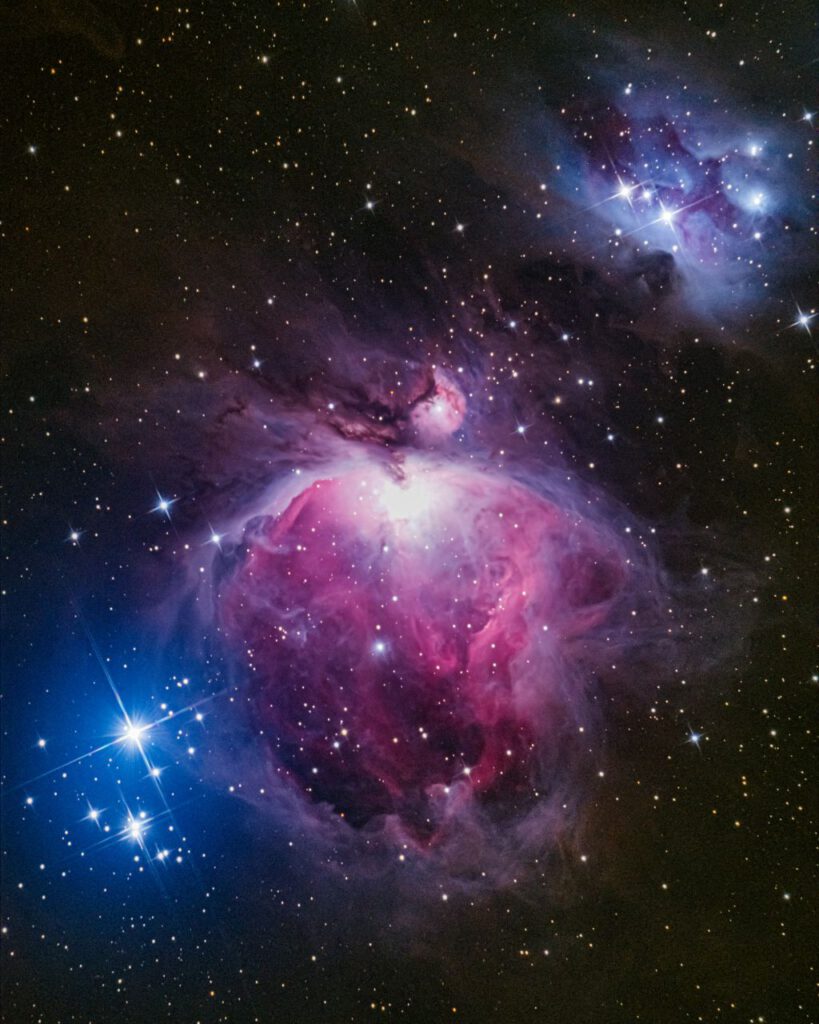 Es ist die Zeit der kalten Winternächte, die – so sie klar sind – mit dem schönsten Sternenhimmel des Jahres aufwarten. Im „Wintersechseck“ der hellsten Sterne finden sich etliche Deep-Sky-Objekte, zu deren bekanntesten zweifelsohne die Plejaden und der Orionnebel gehören. Beide sind bereits mit bloßem Auge sichtbar, im Feldstecher oder kleinen Teleskop beeindruckende Objekte und auch mit bescheidenen Mitteln der Astrofotografie zugänglich. In einer langen mondlosen Nacht richtete ich vom Siegener Südostbalkon aus den Apo auf die Plejaden und anschließend den Newton auf den Orionnebel, beide Instrumente jeweils mit der Astrokamera zum Photonensammeln bestückt.