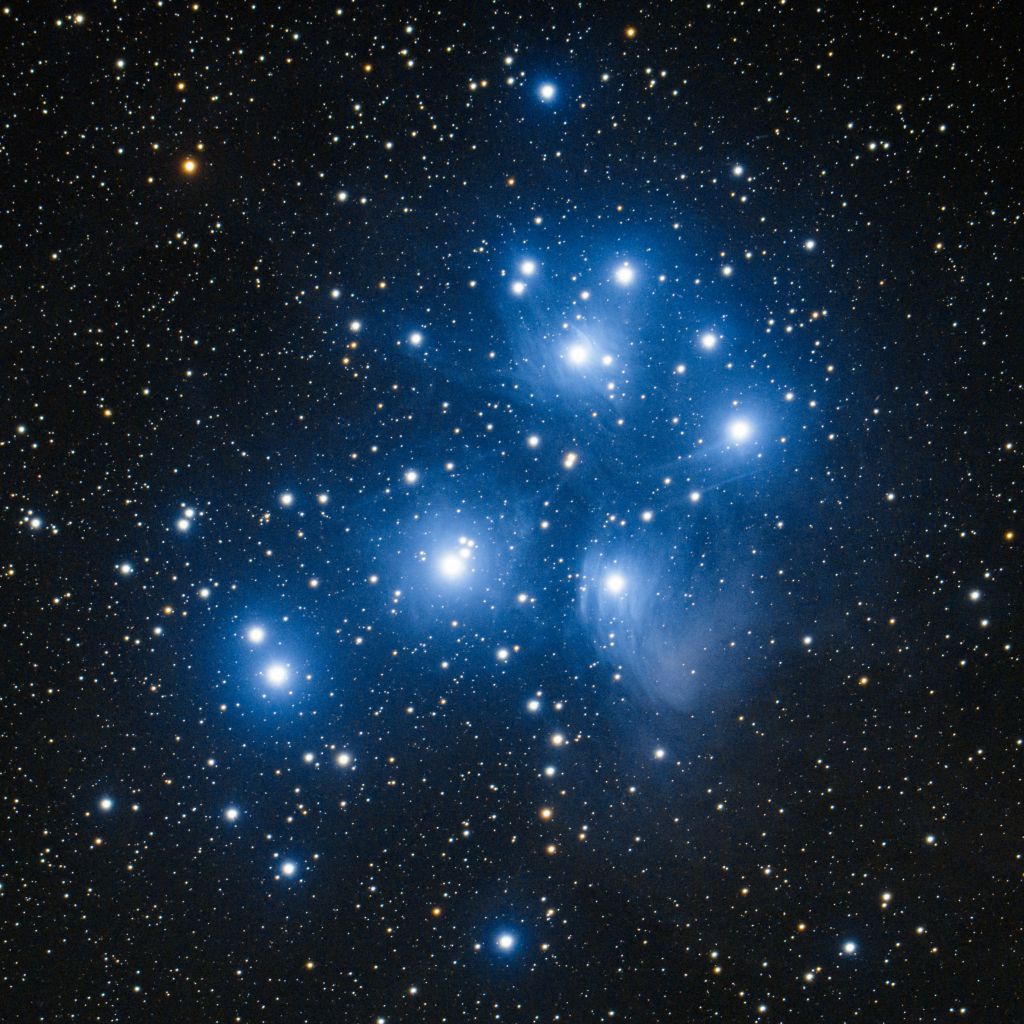 Die Plejaden, im Messier-Katalog unter der Nummer 45 verzeichnet, sind ein offener Sternhaufen von etlichen hundert Sternen in einer Entfernung von etwa 400 Lichtjahren. Die hellsten Sterne stellen in der griechische Mythologie die sieben Töchter des Atlas – daher auch die alternative Bezeichnung „Siebengestirn“ – samt ihrem Vater und ihrer Mutter Pleione dar. Die markante Form ähnelt einer Miniaturausgabe des Sternbilds des Großen Wagen, weshalb die Plejaden manchmal mit dem Kleinen Wagen verwechselt werden. Letzterer ist aber deutlich ausgedehnter und unscheinbarer. Das Foto enthüllt einen bläulichen Reflexionsnebel – hier wird interstellarer Staub von den Sternen angestrahlt, ohne selbst Licht auszusenden.
