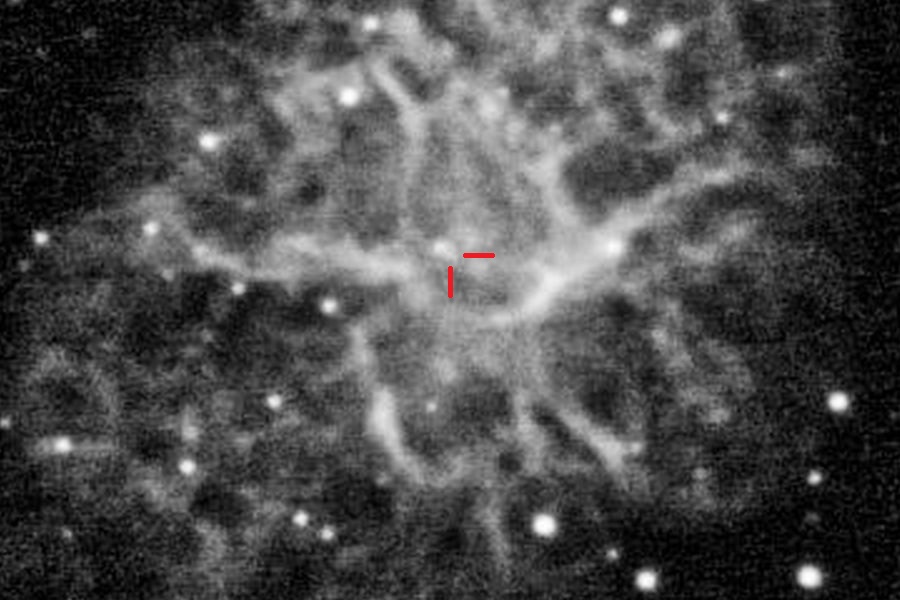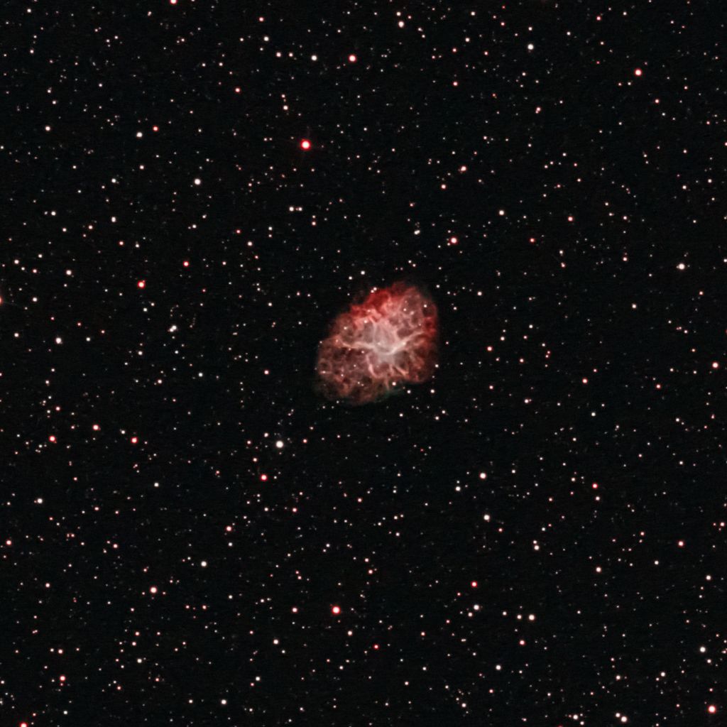 Das obige Bild ist mit dem Duo-Schmalbandfilter aufgenommen, was die Struktur der Filamente im rötlichen Licht der H-alpha-Linie zur Geltung kommen lässt. Im Zentrum des Nebels befindet sich der kollabierte Kern des ehemaligen Sterns, ein Neutronenstern aus entarteter Materie – nur 10 bis 30 km im Durchmesser und damit so groß wie eine Stadt, aber so schwer wie die Sonne. Dieser Neutronenstern dreht sich 30 mal pro Sekunde (!) um die eigene Achse und sendet dabei jeweils einen Lichtimpuls aus – daher auch die Bezeichnung „Pulsar“. Aufgrund der Filterung ist er auf dem Bild nur schwer zu erkennen. Hier eine kontrastverstärkte Ausschnittsvergrößerung: