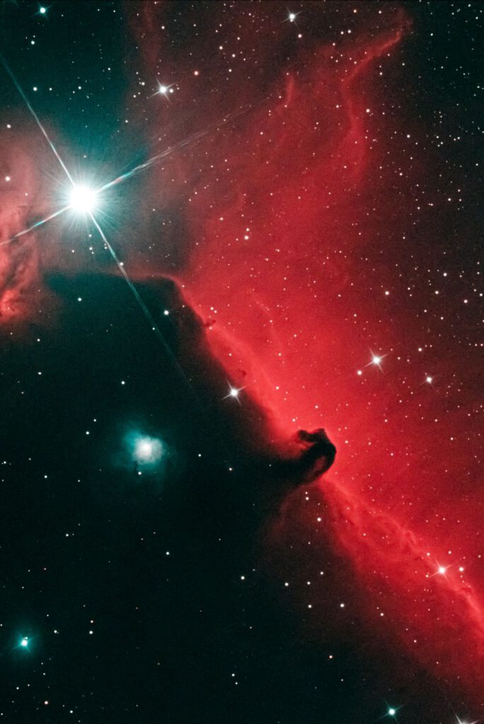 Vom Krebs zum Pferd. Hier braucht es nun weniger Fantasie, um in der Dunkelwolke vor dem roten Emissionsnebel einen Pferdekopf zu erkennen: